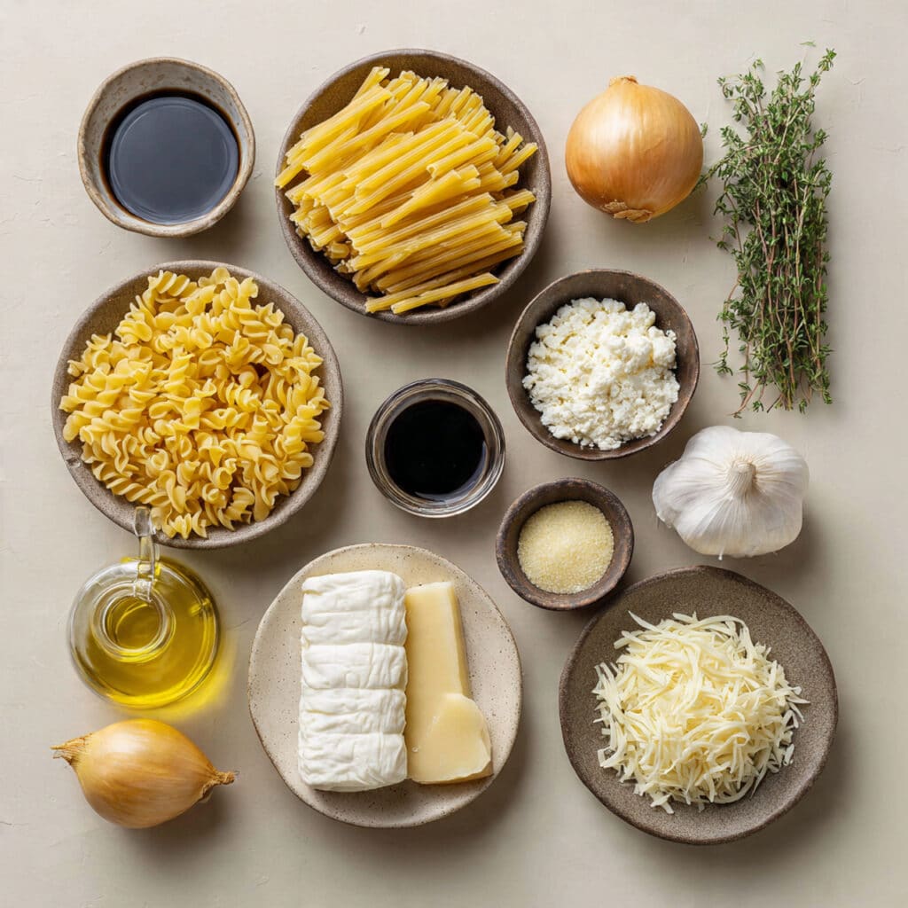 A comforting baked pasta layered with sweet caramelized onions, tangy balsamic vinegar, creamy goat’s cheese, and a golden blend of mozzarella and parmesan. This cozy dish is rich, flavorful, and perfect for weeknight dinners or casual gatherings.
