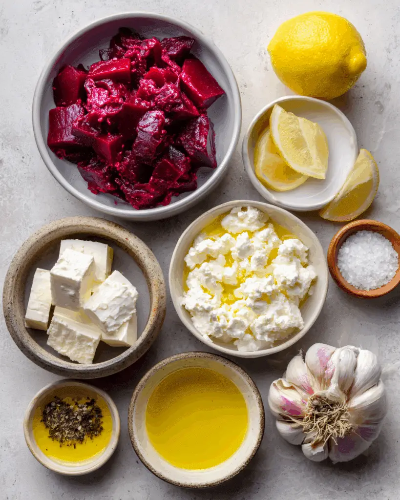 - Combine Ingredients: In a food processor or blender, add chopped beets, feta, yogurt, garlic, lemon juice, and salt.