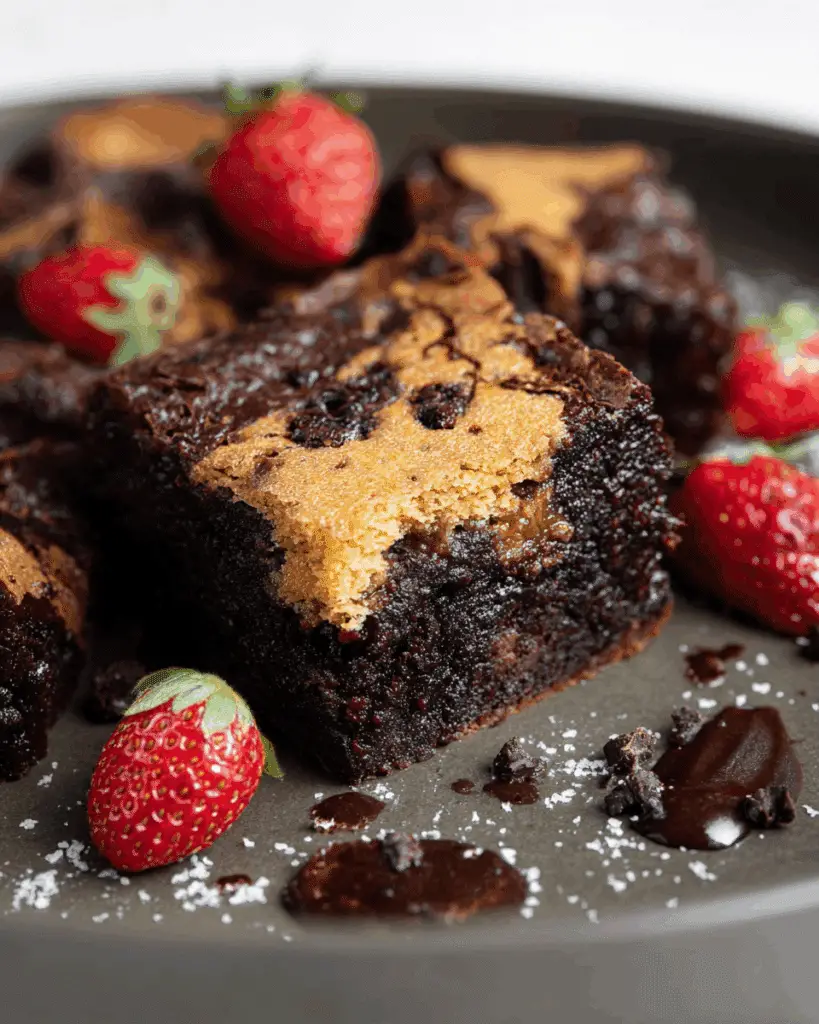 Der untere Teil ist fudgy, saftig und intensiv schokoladig, während die obere Cookie-Schicht knusprig und buttrig ist. Zusammen ergibt sich ein unvergleichlicher Kontrast, der jeden Bissen spannend macht.
