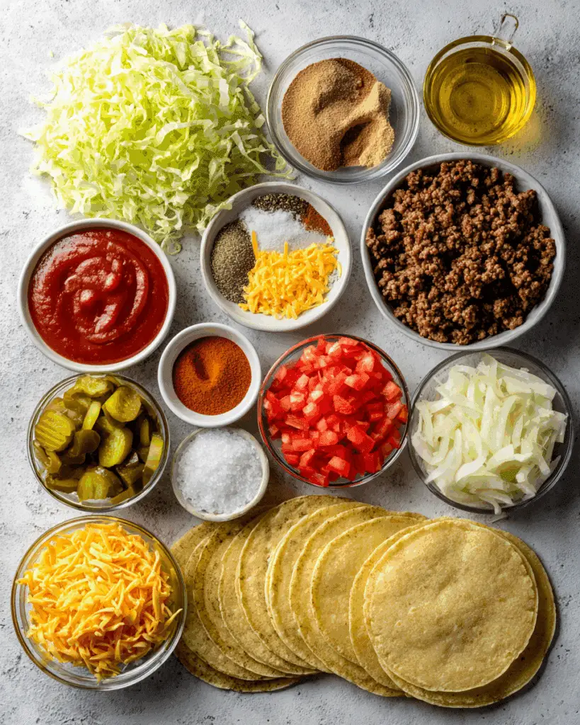- Taco-Sized Tortillas: 8 small — The crispy yet soft base for the burger filling.