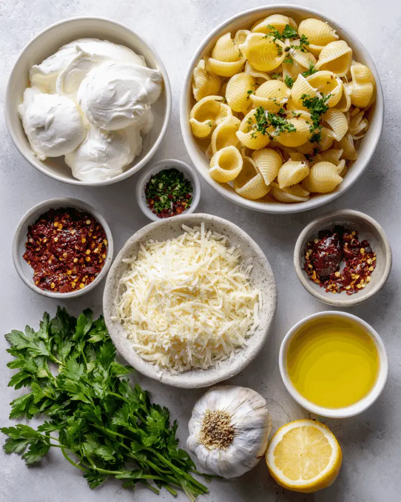 Ingredients in Burrata Pasta Shells with Roasted Garlic & Lemon Cream