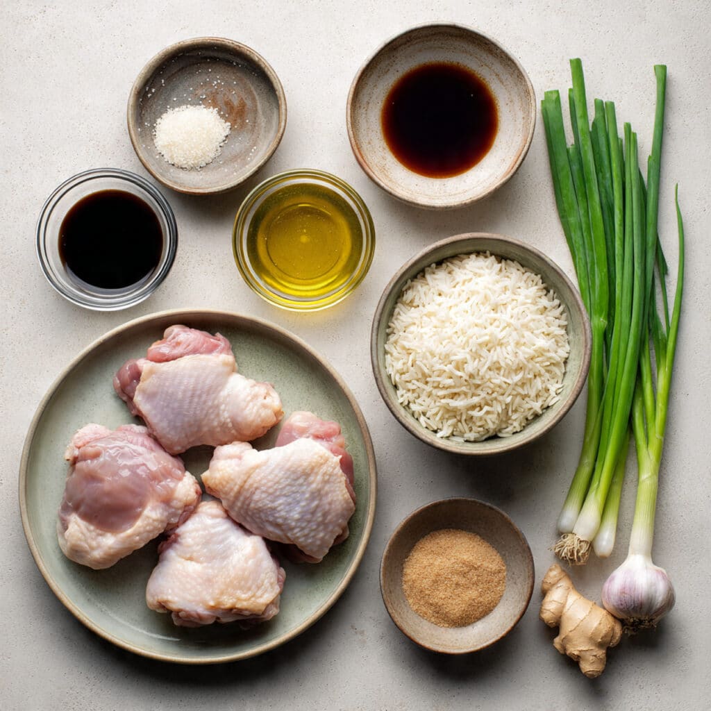The magic here is in the contrast. Tender chicken coated in a glossy soy glaze, soft rice soaking up the broth, and little bursts of freshness from the green onions. As the dish simmers, the soy and sugar thicken slightly, creating a broth that feels rich without being heavy.