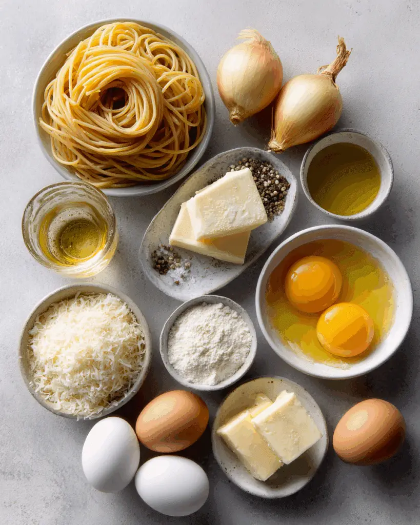 This recipe was born from a craving for comfort food with a little elegance, the kind you whip up after a long day but still feel proud to serve to guests. One evening, as I stared at a few pantry staples, a handful of onions and some pasta called to me. I started slicing, slow-cooking them until golden and sweet, then marrying them with silky eggs, cheese, and spaghetti. And just like that, a star was born in my kitchen — simple, satisfying, and irresistibly cozy.