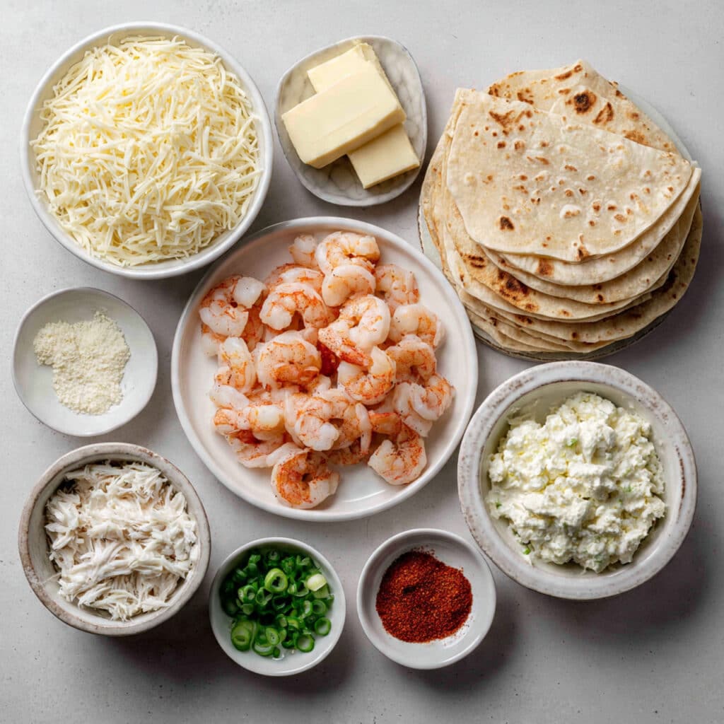 This flavor-packed recipe brings a dreamy combination of seafood and cheese wrapped in crispy tortillas. Here’s what you’ll need:
