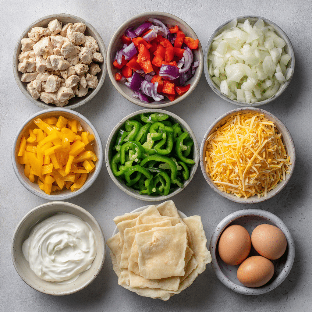 2. Combine Ingredients: In a large skillet, heat olive oil over medium-high heat. Sauté sliced red and green bell peppers and sliced onion until softened, about 5 to 7 minutes. Add minced garlic and cook 30 seconds until fragrant. Add diced cooked chicken, chili powder, ground cumin, smoked paprika, salt, and black pepper. Stir to combine and warm through. Remove from heat and stir in sour cream and shredded cheddar until evenly mixed.