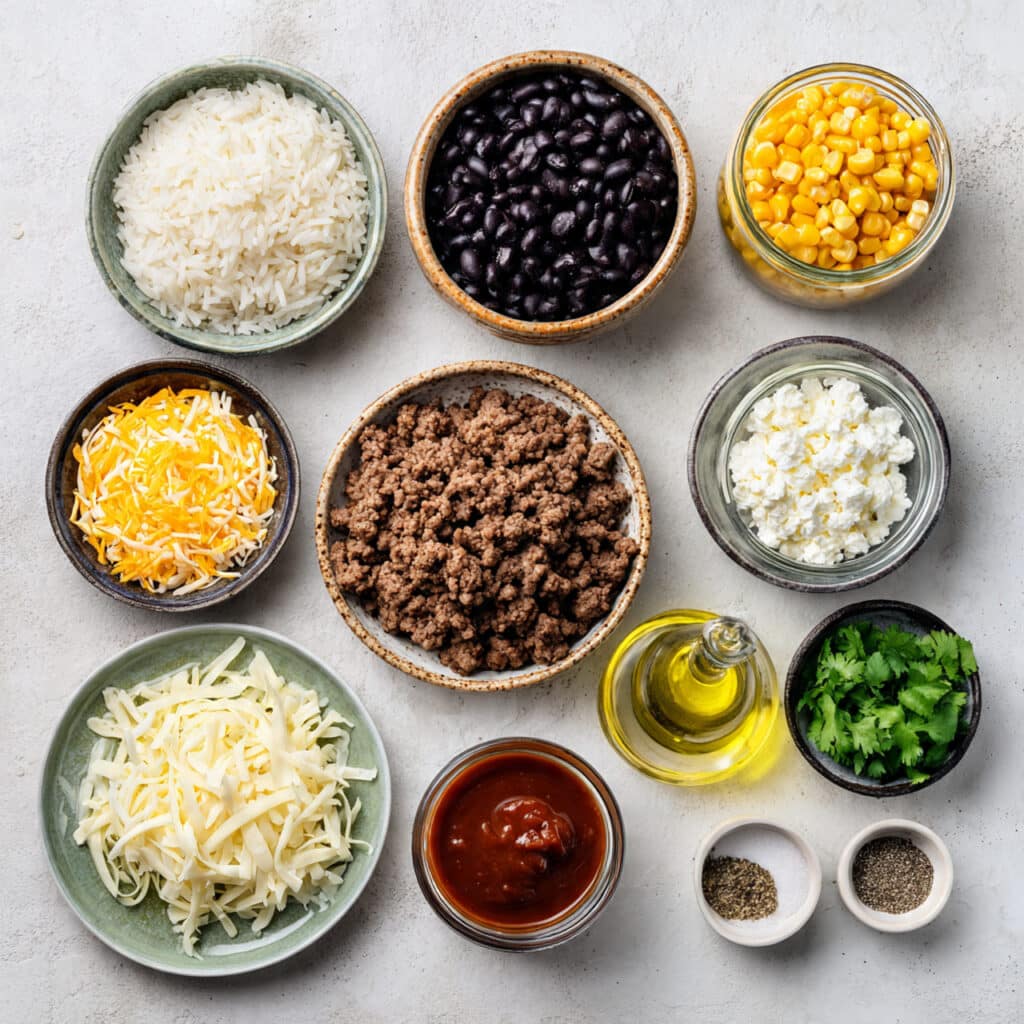 A cozy and flavorful enchilada-inspired bowl layered with seasoned beef, rice, beans, corn, and creamy cottage cheese for a satisfying and easy meal.