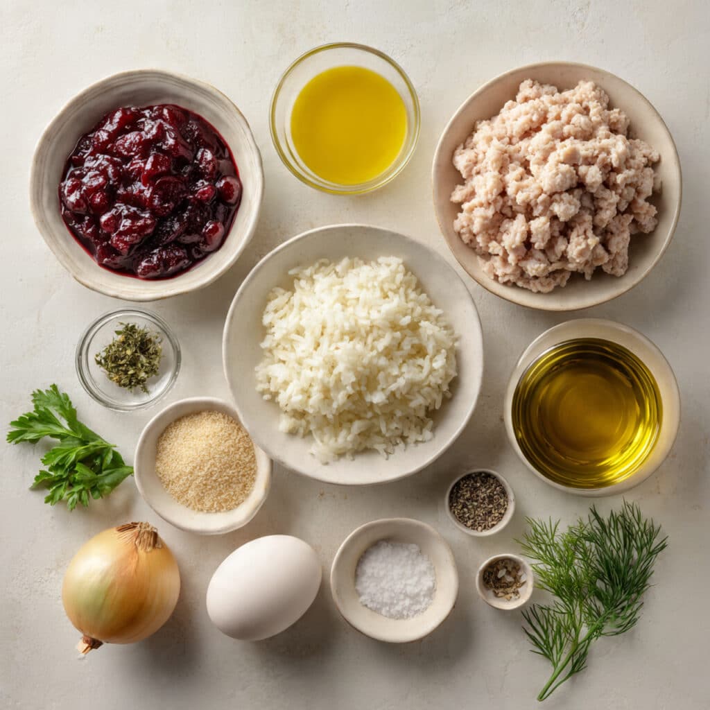 Ingredients in Cranberry-Glazed Turkey Meatballs with Herb Rice
