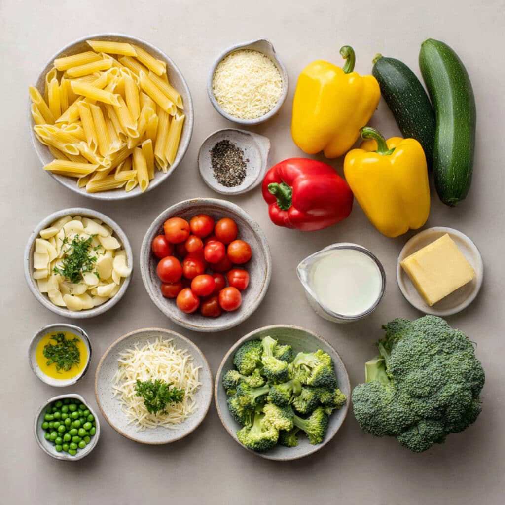 This dish comes together from simple ingredients that each bring something important to the table. The pasta gives it body, the vegetables bring freshness and color, and the cream sauce wraps everything together into one dreamy, satisfying bowl.