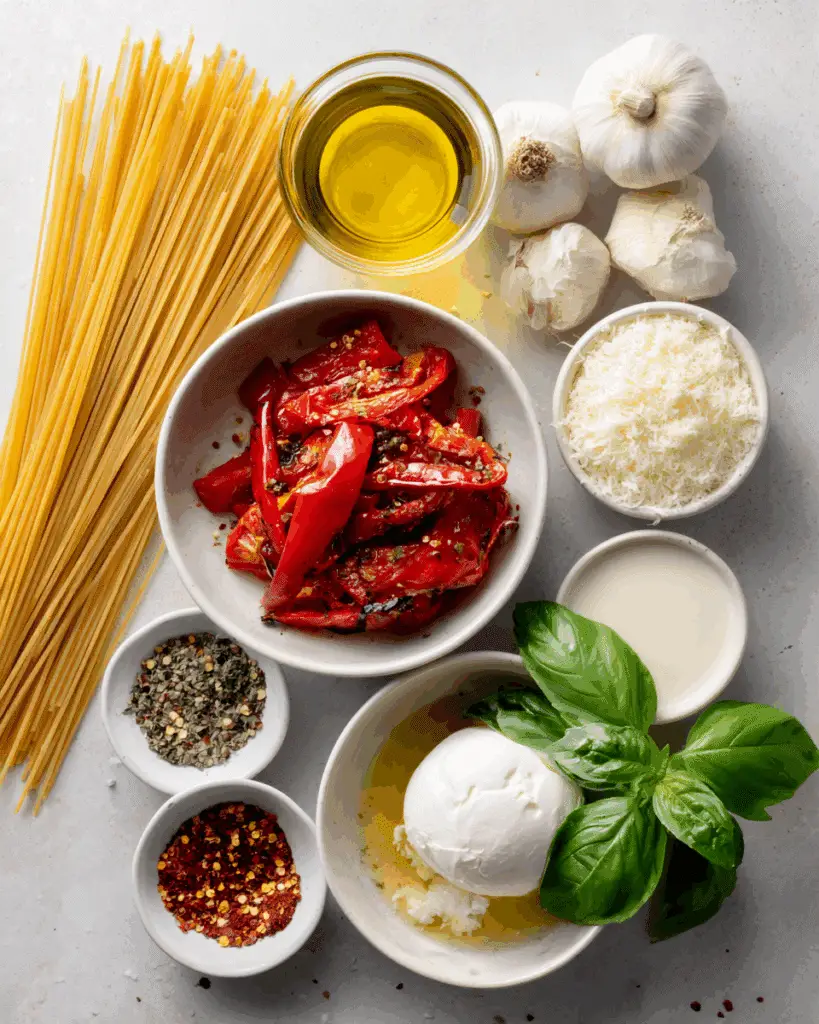 Ingredients in Creamy Red Pepper Pasta with Burrata and Herbs