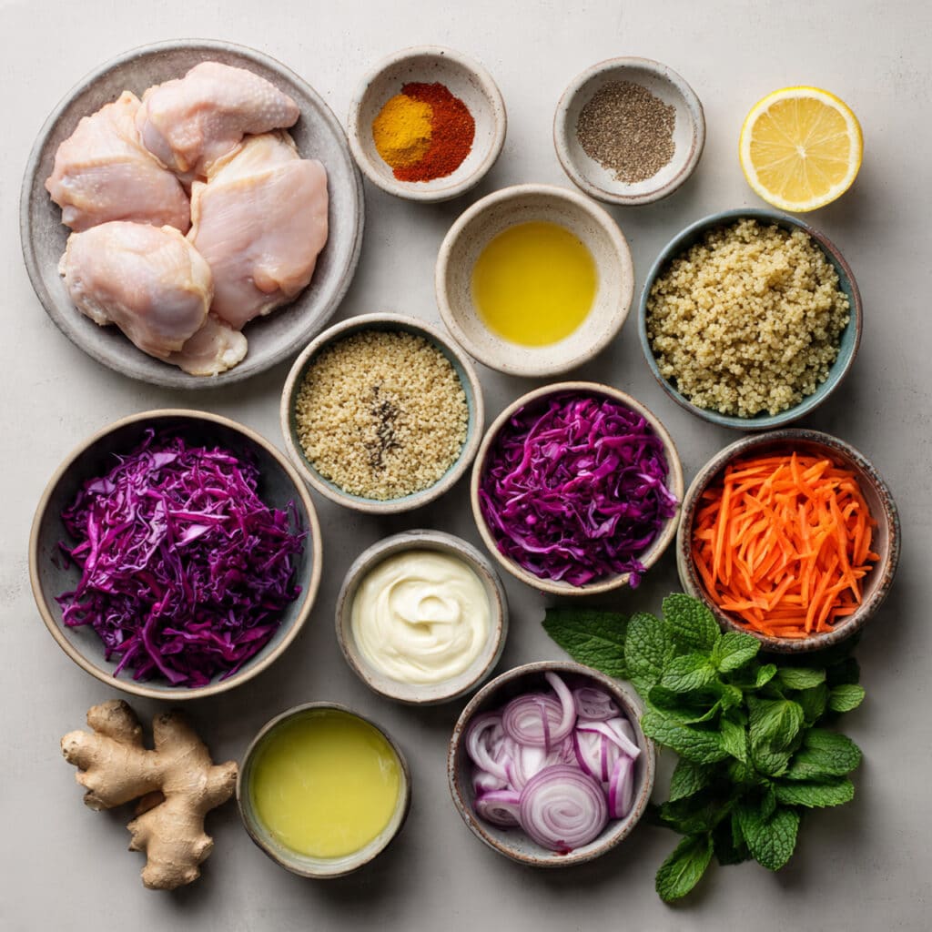 - Build bowls with quinoa, red cabbage, carrots, cucumber, red onion, chicken, and drizzle with mint sauce. Serve and enjoy.