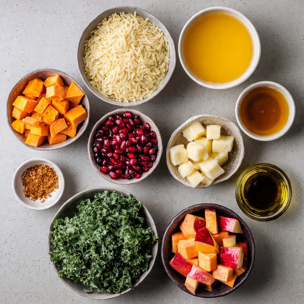 A vibrant and hearty salad featuring crispy parmesan-coated orzo, roasted sweet potatoes, fresh kale, apples, dates, and juicy pomegranate seeds, all tossed in a zesty orange maple vinaigrette. It’s the perfect balance of crunch, sweetness, and citrusy brightness.