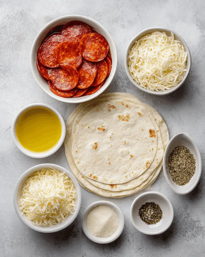 - Combine Ingredients: On a cutting board, layer mozzarella, pepperoni, pizza sauce, oregano, and garlic powder in the center of the tortilla.