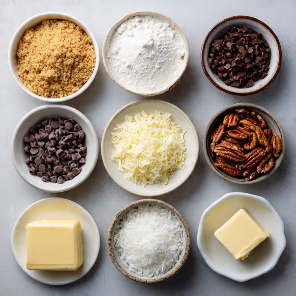These bars are all about contrast. The crust is crisp and buttery, giving way to soft melted chocolate, chewy coconut, and crunchy pecans. The sweet condensed milk ties it all together, caramelizing as it bakes and creating that signature gooey bite.
