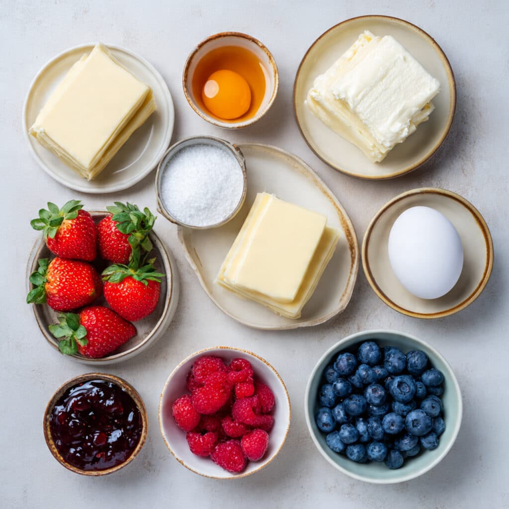 - Assemble the Dish: Cut the puff pastry sheets into rectangles. Spoon a small amount of cream cheese mixture in the center of each piece, then top with sliced strawberries, blueberries, and raspberries.