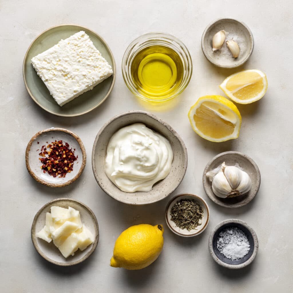 - Combine Ingredients: Add feta cheese, Greek yogurt, garlic cloves, lemon juice, chili flakes, salt, and black pepper into the processor.