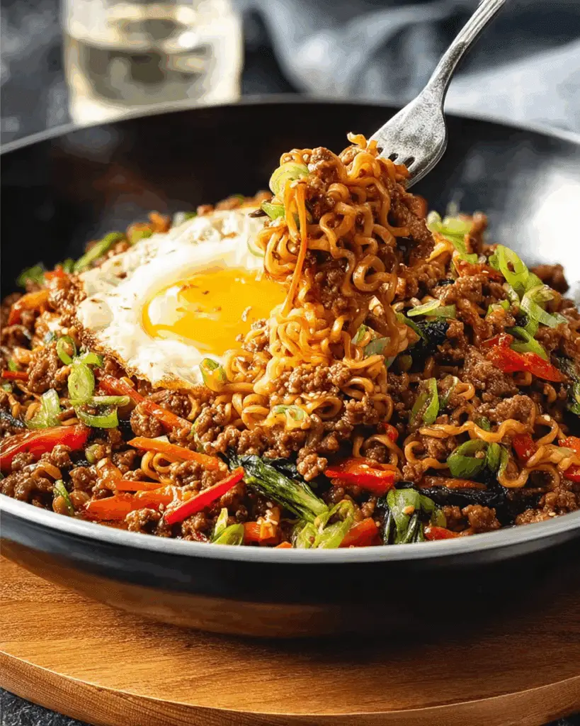 A cozy one-skillet dinner where tender ramen noodles tangle with juicy ground beef, crisp veggies, and a glossy sweet-salty sauce. Fast, budget-friendly, and incredibly satisfying.