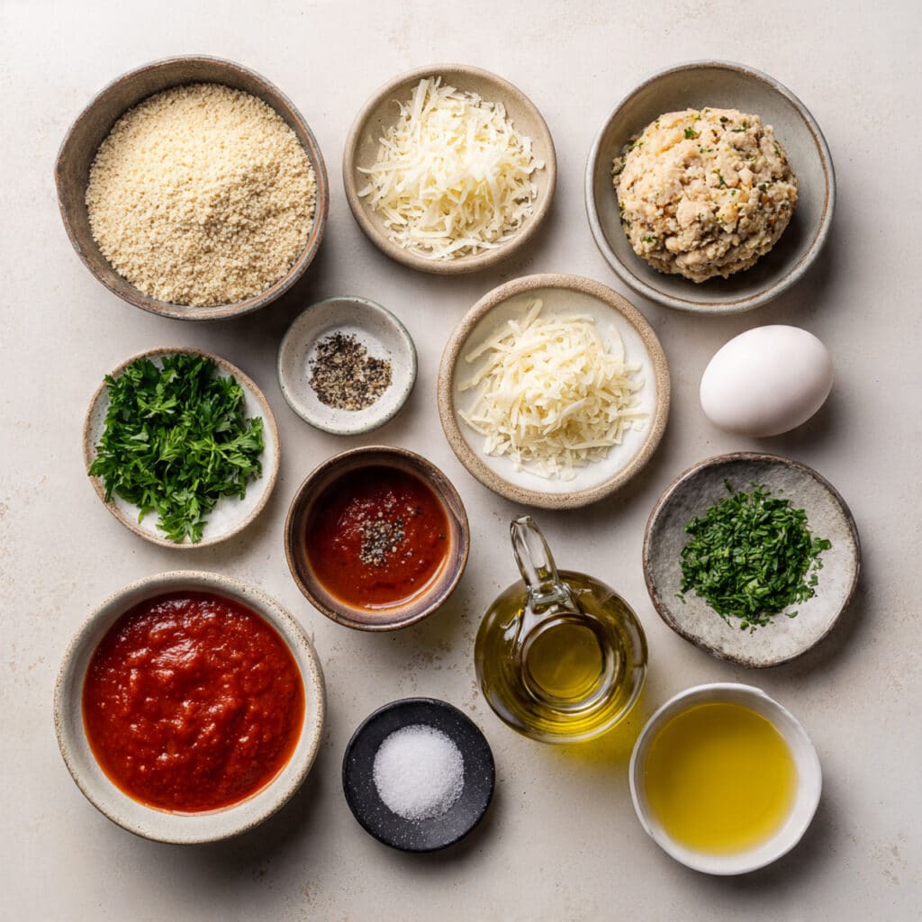 - Combine Ingredients: In a bowl, mix ground chicken, breadcrumbs, parmesan, egg, garlic, parsley, salt, and pepper until just combined.