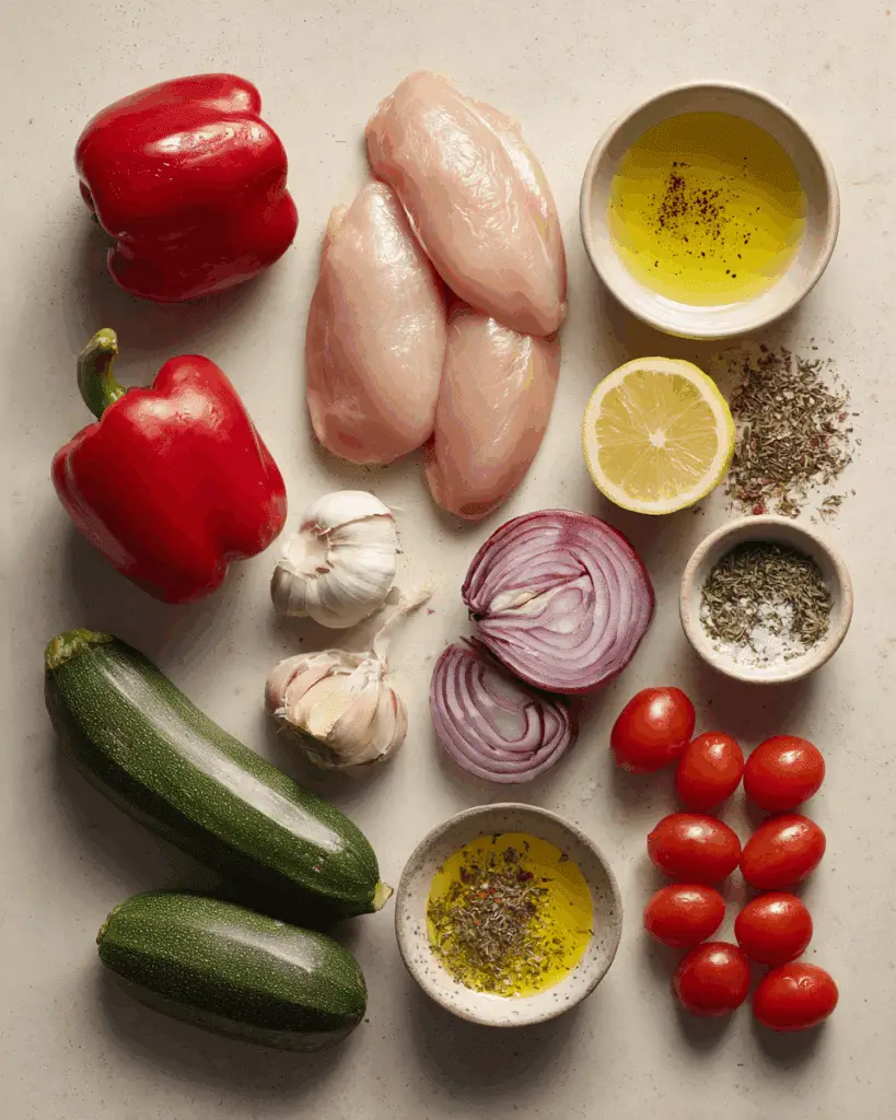 - Combine Ingredients: In a large bowl, whisk olive oil, lemon juice, garlic, oregano, salt, and pepper. Add chicken and vegetables, then toss until everything is well coated.