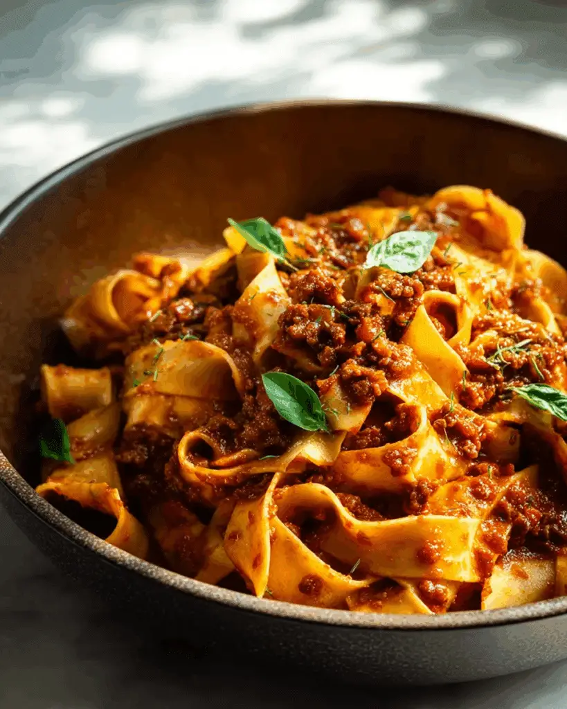 A rich and comforting Italian classic, Hearty Pappardelle Bolognese features wide ribbons of pasta smothered in a slow-simmered meat sauce bursting with flavor.