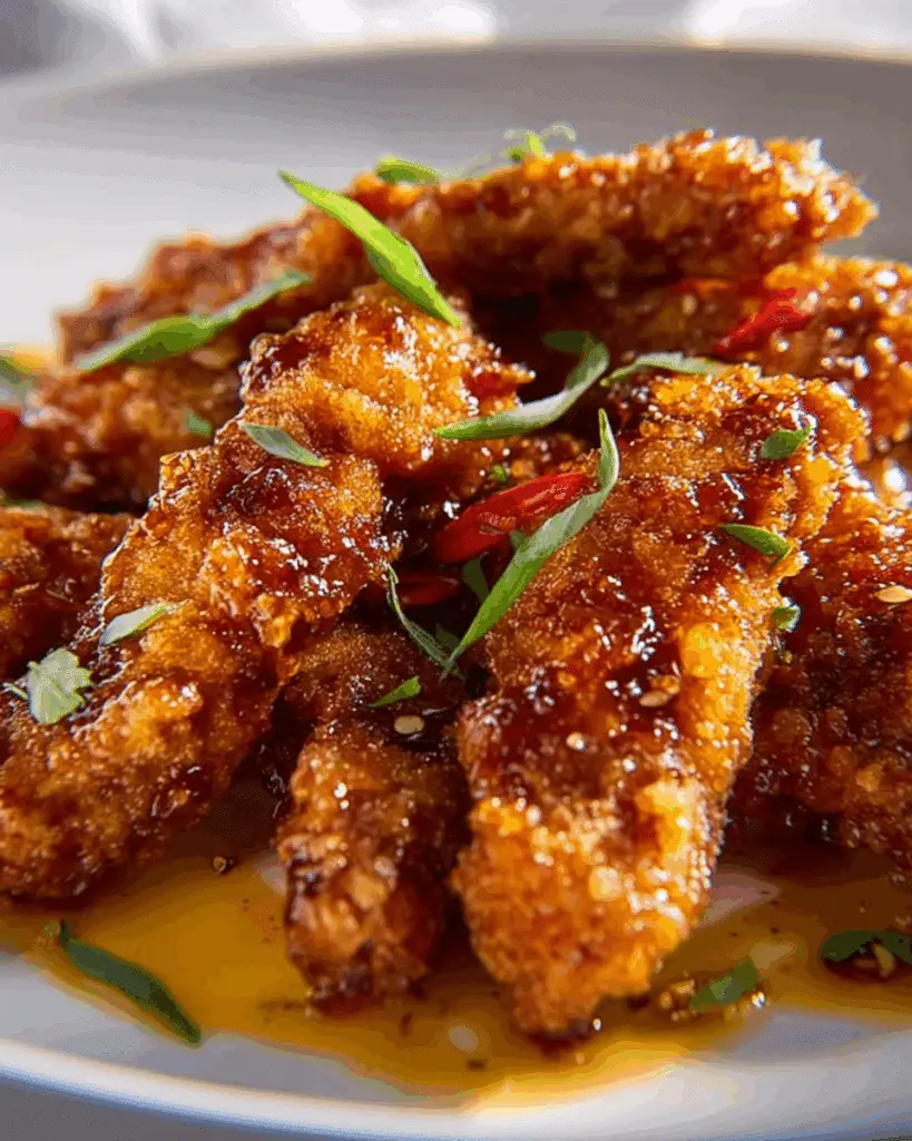 Crispy chicken tenders tossed in a sticky hot honey garlic glaze that balances sweet, spicy, and savory in every crunchy bite.