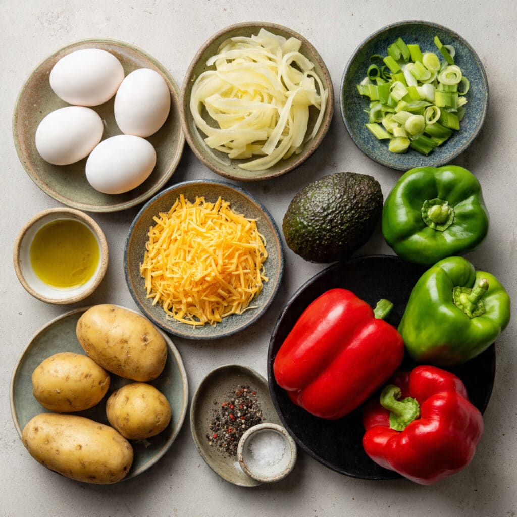 The crispy edges of the roasted potatoes contrast beautifully with the soft scrambled eggs. The cheddar melts slightly, weaving its sharpness into the eggs, while the avocado cools and smooths each bite. Bell peppers add gentle sweetness and crunch. Together, these layers create a bowl that feels complete and deeply satisfying.