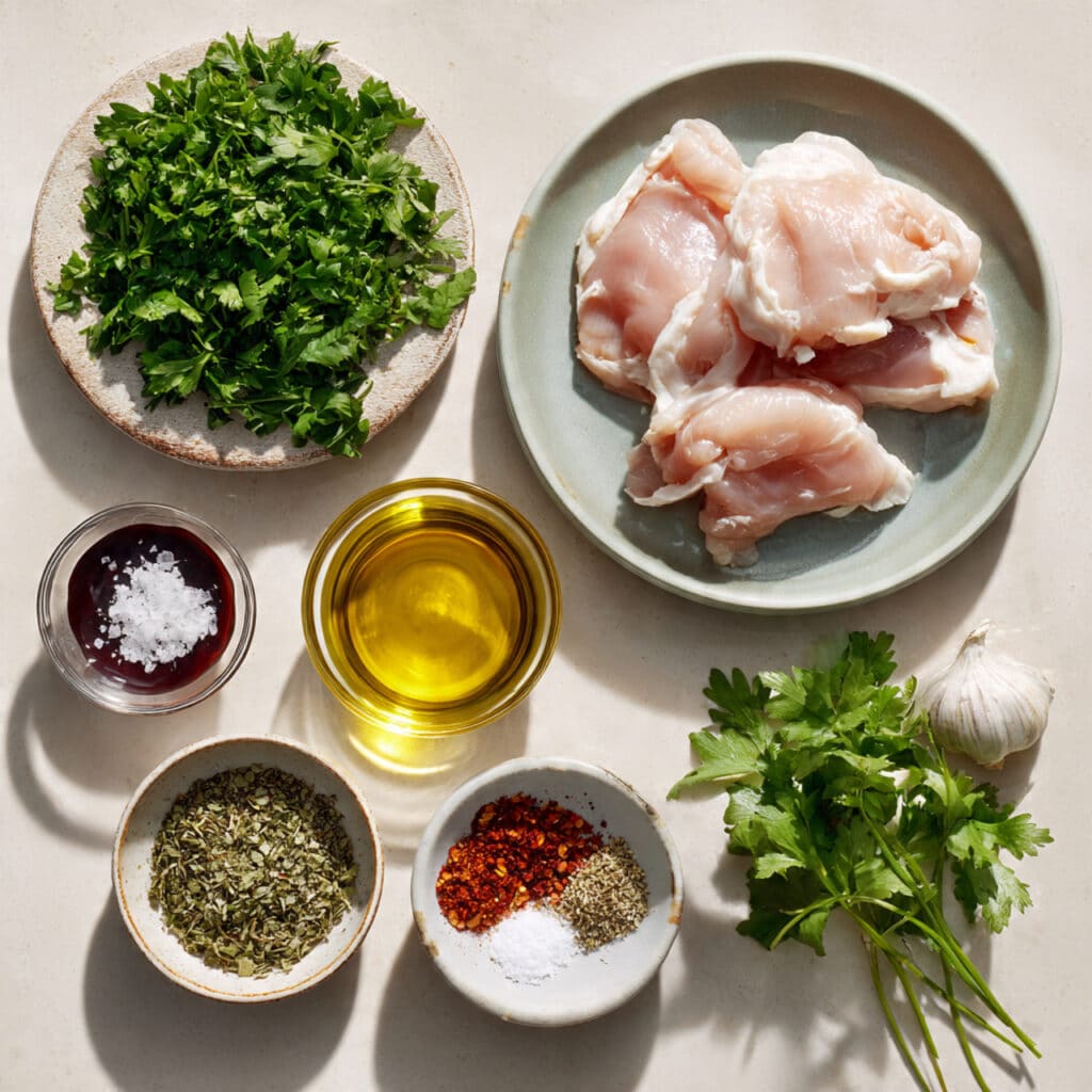 - Combine Ingredients: In a bowl, mix parsley, cilantro, garlic, olive oil, vinegar, oregano, red pepper flakes, salt, and black pepper.