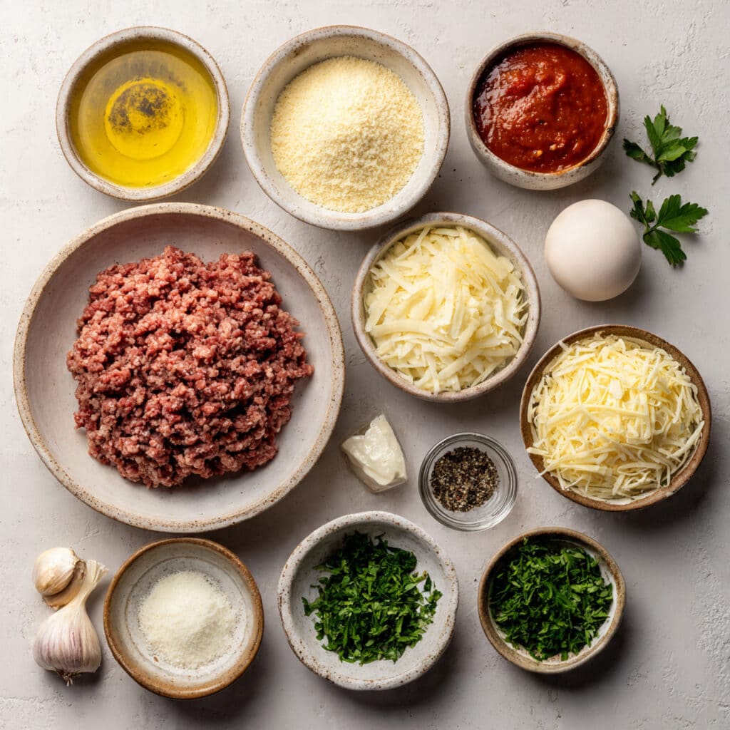 - Combine Ingredients: In a large bowl, gently mix ground beef, breadcrumbs, egg, parmesan, minced garlic, parsley, salt, and black pepper until just combined.