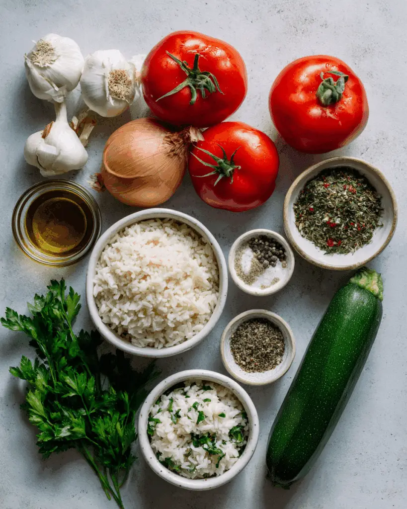 2. Combine Ingredients: In a mixing bowl, combine the cooked rice, chopped onion, minced garlic, grated zucchini, parsley, oregano, salt, pepper, and 2 tablespoons of olive oil. Stir until fully blended.