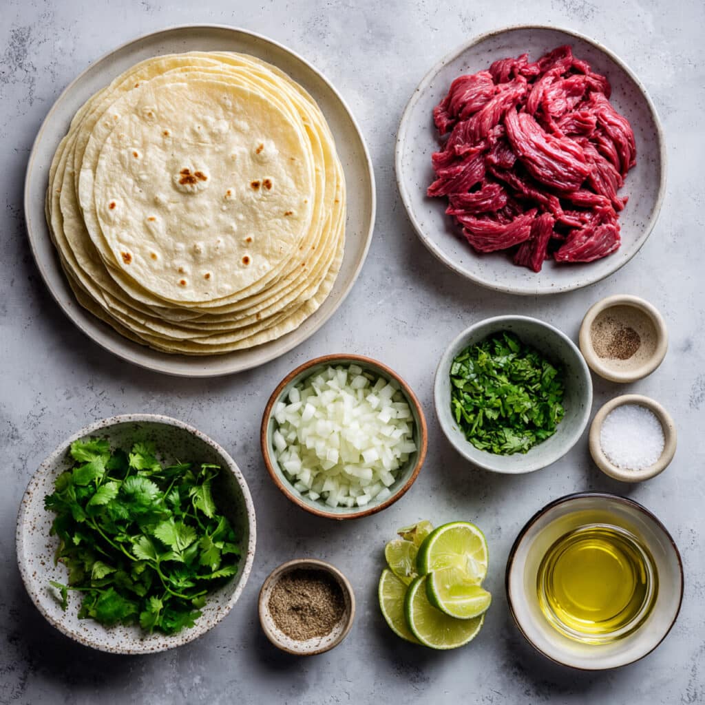 - Serve and Enjoy: Fill each tortilla with beef, top with onions and cilantro, and finish with a squeeze of lime