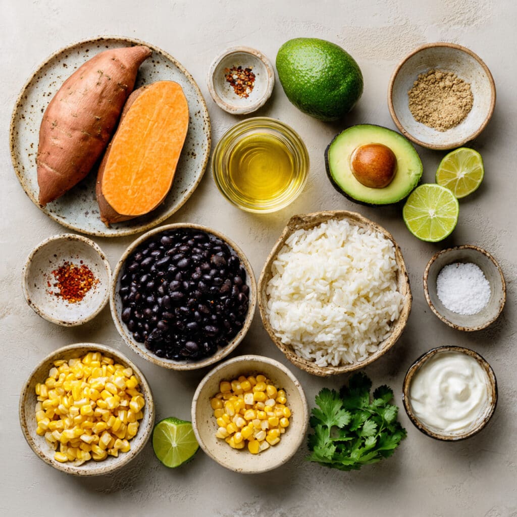 - Assemble bowls with rice, black beans, roasted sweet potatoes, avocado, corn, and cilantro.