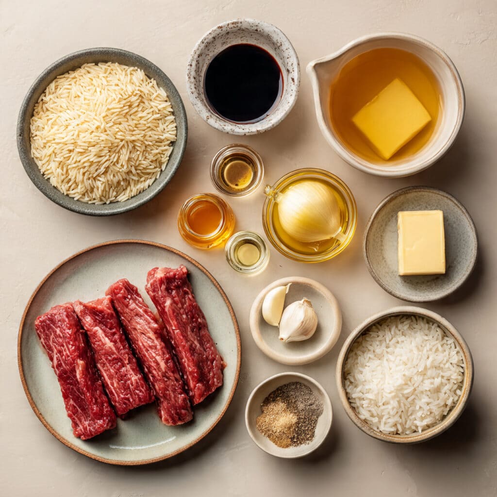 - Assemble the Dish: Add steak strips and sear until browned, then remove and set aside. In the same skillet, add onion and garlic, cooking until fragrant. Stir in rice and toast lightly.