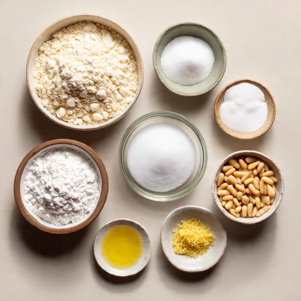 Pine Nuts: These small buttery nuts are the heart of the cookie’s identity. When they toast in the oven, they develop a rich aroma and a lightly crisp texture that contrasts perfectly with the soft almond interior.