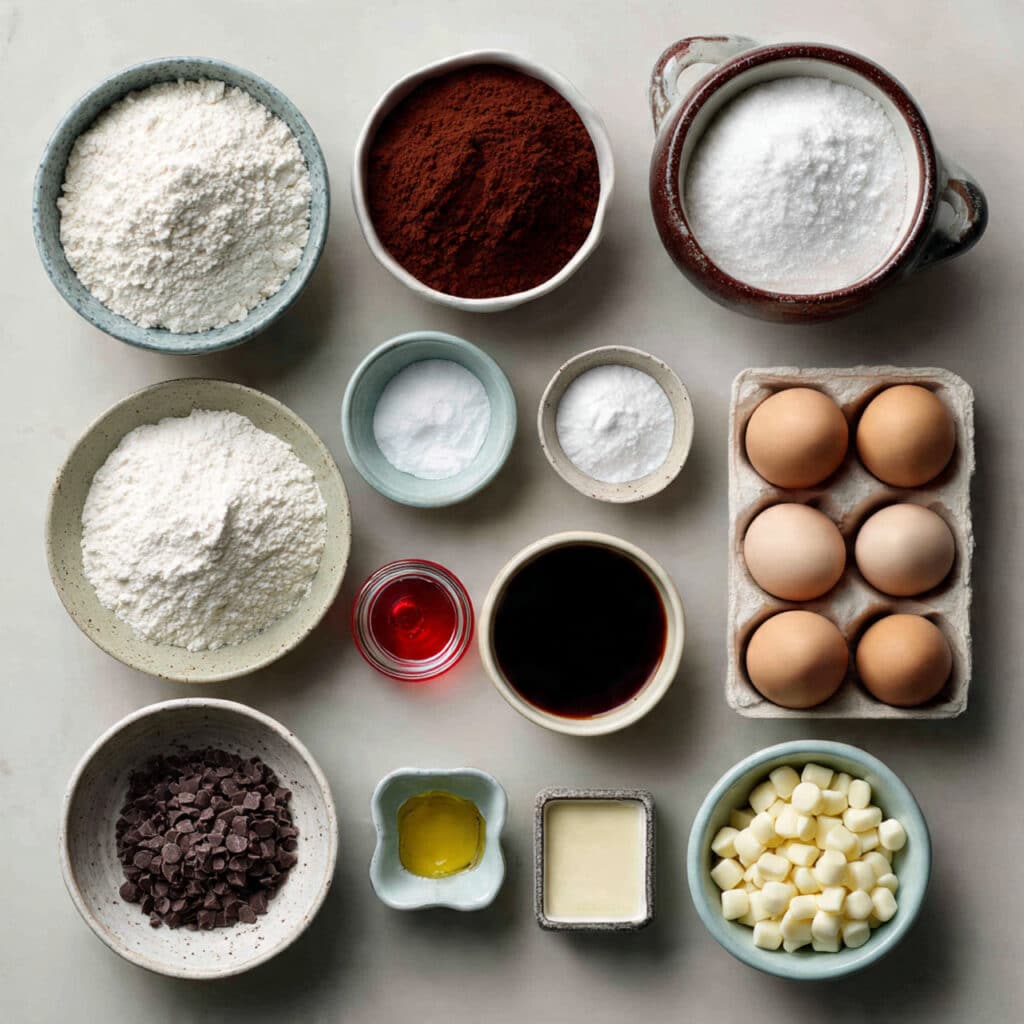 - Combine Ingredients: In one bowl, whisk together flour, cocoa powder, baking powder, baking soda, and salt. In another, mix sugar, eggs, buttermilk, vegetable oil, red food coloring, and vanilla until smooth. Gradually combine wet and dry ingredients until fully incorporated.