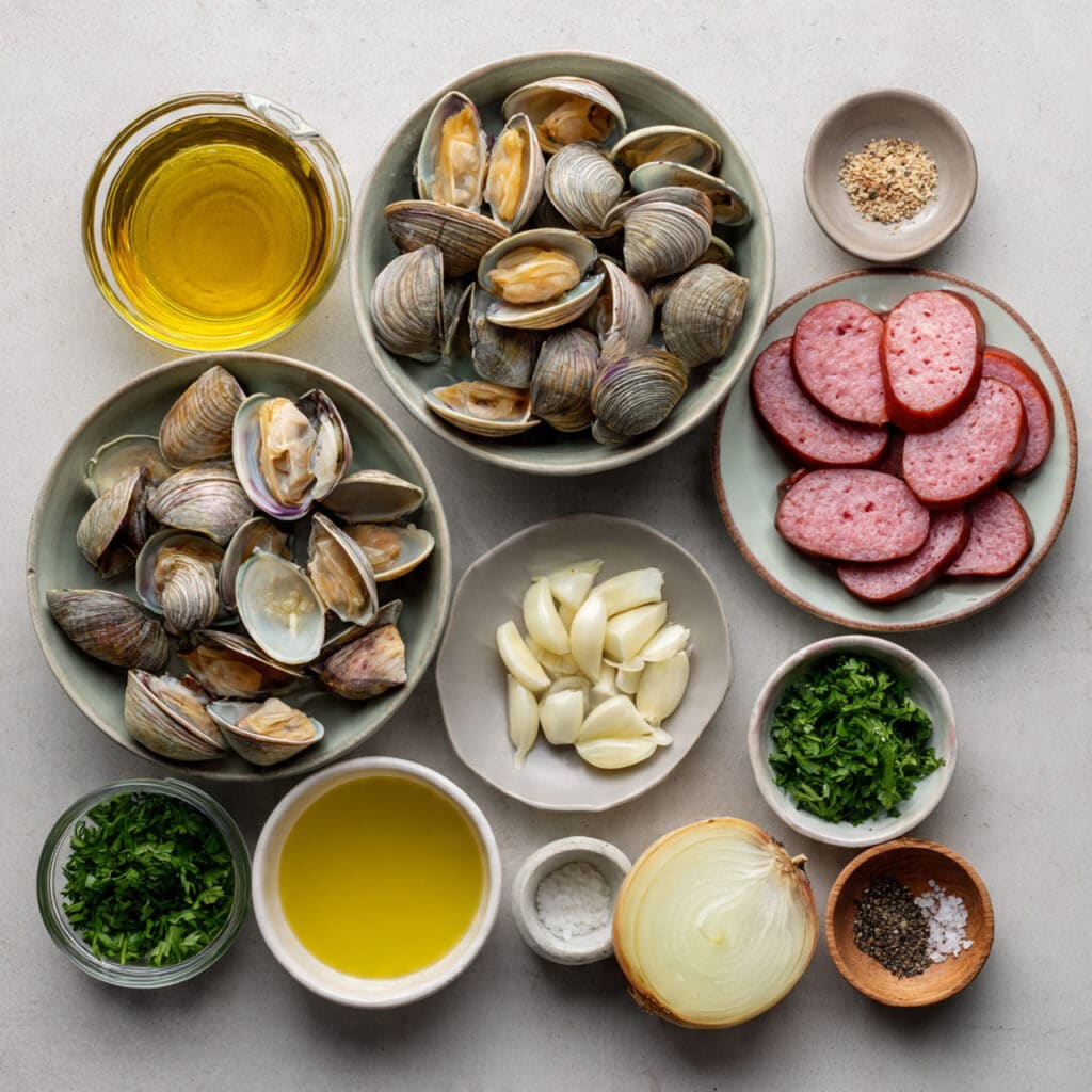 A rich and comforting seafood dish where tender clams are gently steamed in a flavorful broth with smoky sausage, garlic, and herbs, creating a perfect balance of ocean freshness and savory depth.