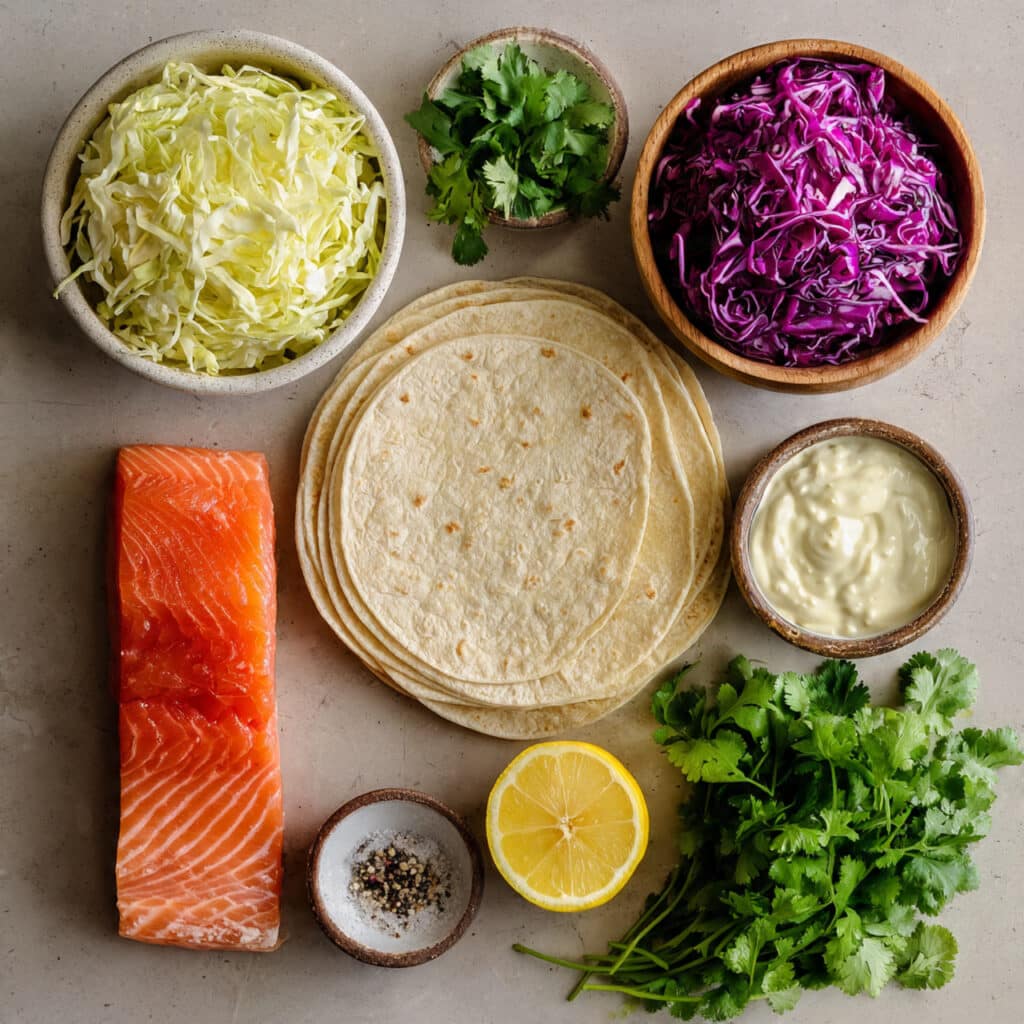 This recipe came to life on a sunny afternoon when all I had in the fridge were leftover grilled salmon, some tortillas, and a jar of Caesar dressing. It was a happy accident that turned into a house favorite. Over time, I fine-tuned it, playing with fresh herbs, a touch of citrus, and crunchy cabbage until it became what it is today — a taco that feels both comforting and gourmet.