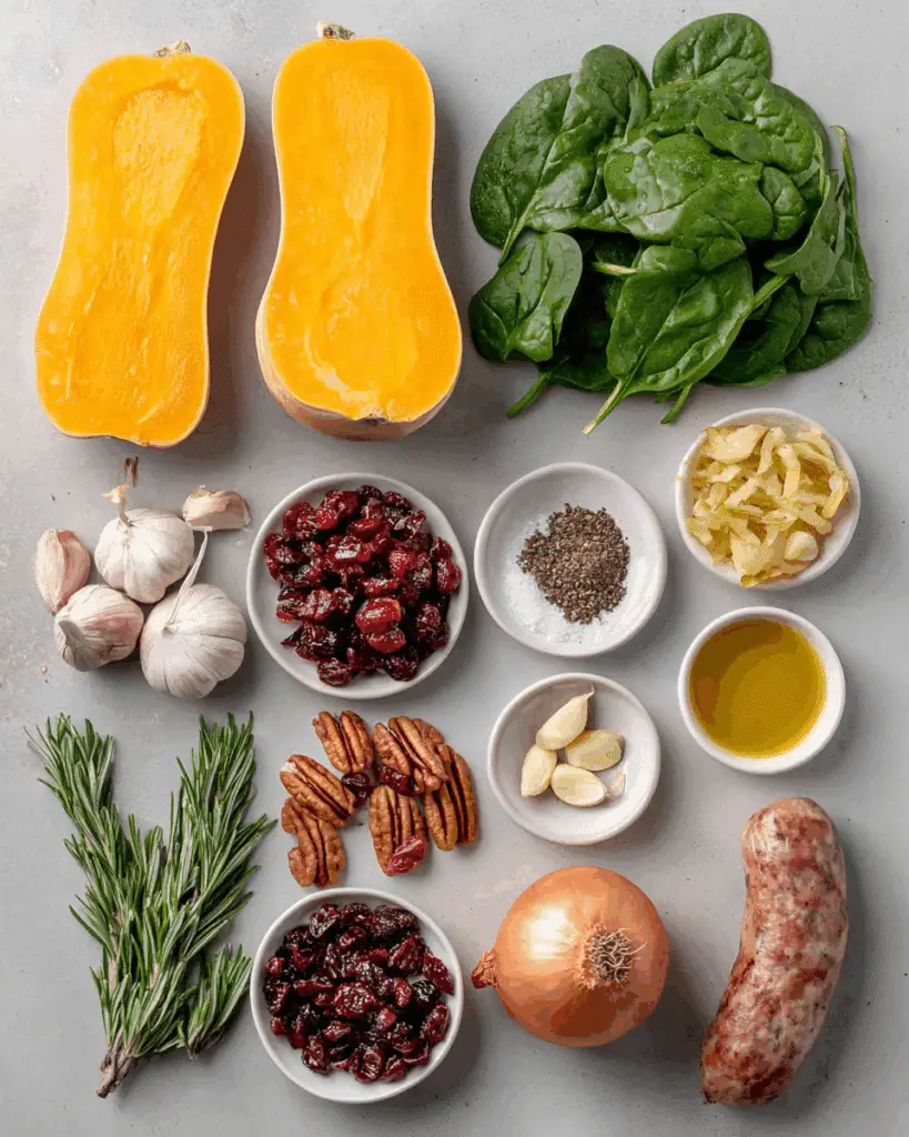 Ingredients in Sausage Stuffed Butternut Squash with Spinach, Pecans, and Cranberries