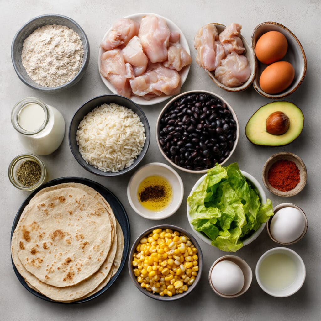 - Serve and Enjoy: Layer rice in a bowl, add beans, corn, lettuce, tomatoes, avocado, and top with crispy chicken and tortilla strips.