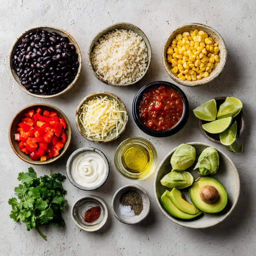 - Assemble the Dish: In a large bowl, combine rice, black beans, corn, peppers, tomatoes, and spices.