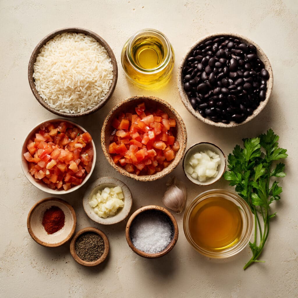 A comforting one-pot Spanish rice and beans dish made with simple pantry ingredients, infused with warm spices, tomatoes, and herbs for a hearty and satisfying meal.