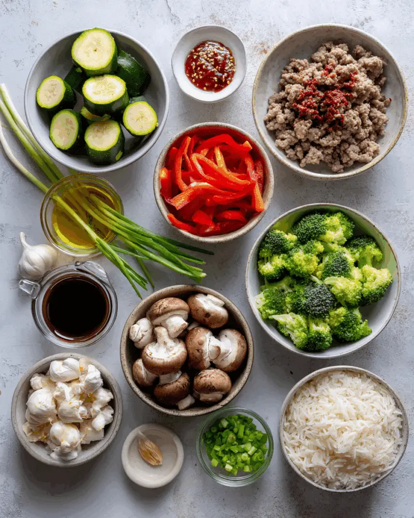 Ingredients in Spicy Ground Beef Stir-Fry Bowl with Garlic Veggies & Steamy Rice