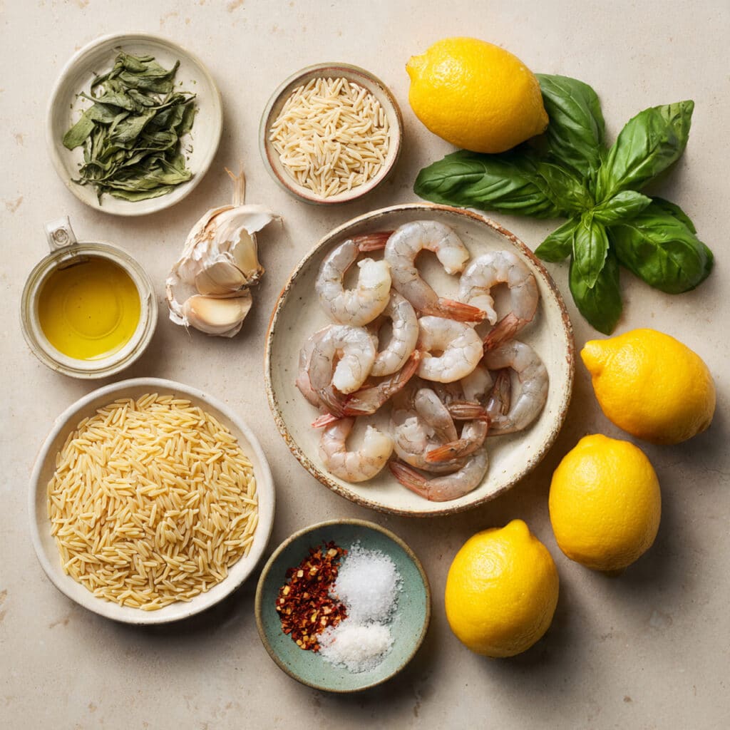 Ingredients in Spicy Southern Style Shrimp with Lemon Basil Orzo