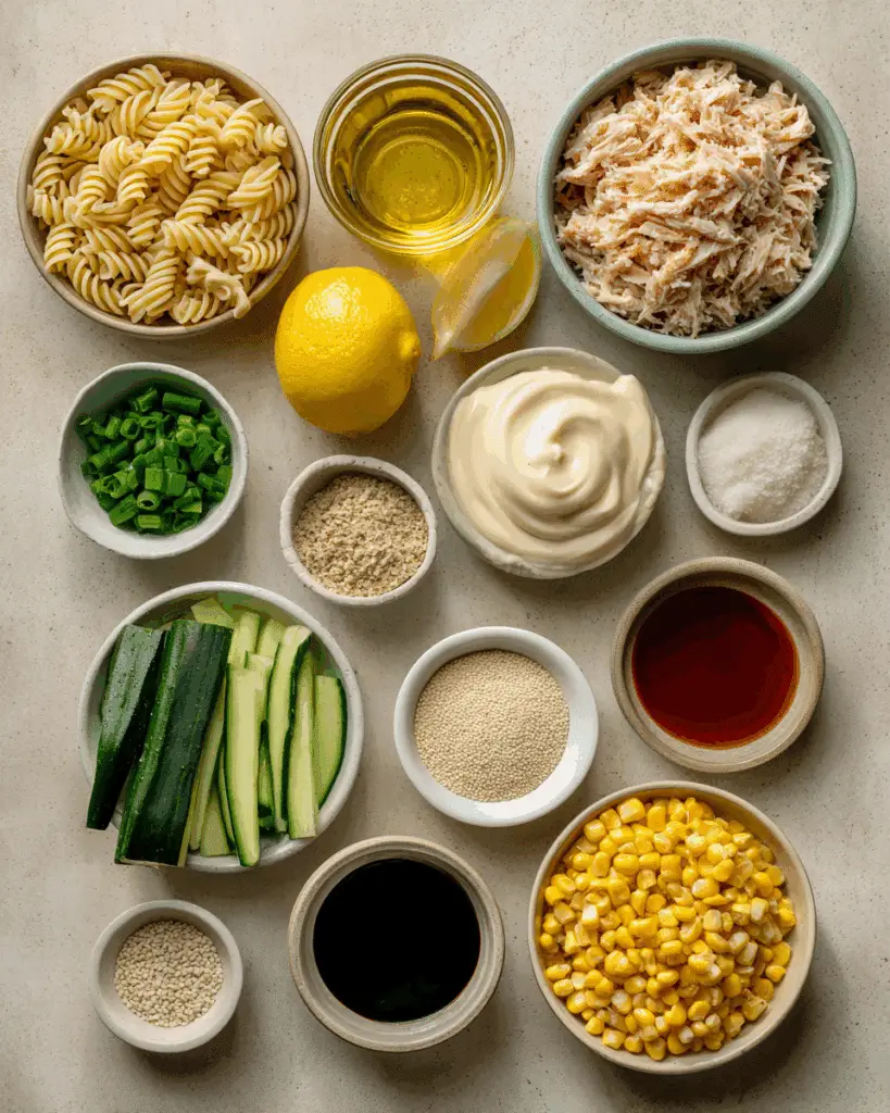 4. Assemble the Dish: In a large mixing bowl, combine cooled pasta, drained tuna, diced cucumber, corn, and green onion.