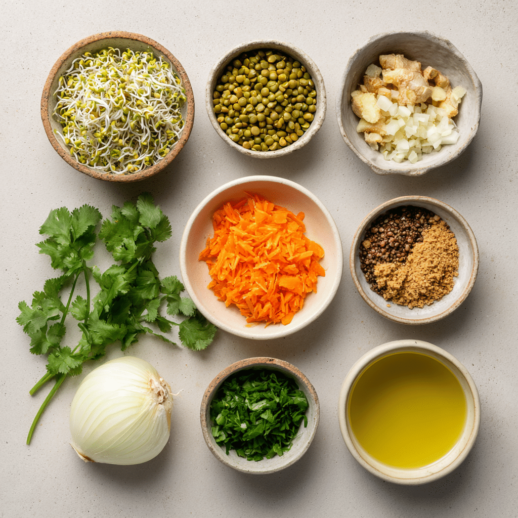 1. Sprouted Moong Beans: 1.5 cups – The star of the dish, bringing protein, fiber, and a soft bite.