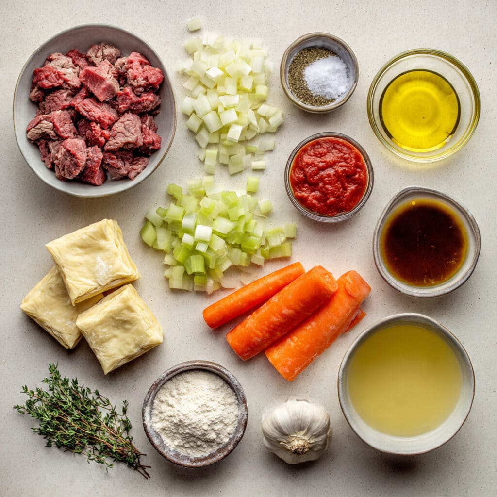 Puff Pastry: This magical sheet of dough transforms into a golden, crispy top that shatters with every forkful, balancing the hearty filling with a light crunch.