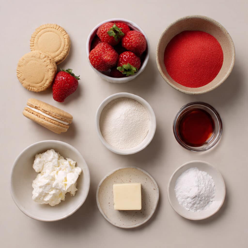 - Combine Ingredients: In a large bowl, beat the softened cream cheese, powdered sugar, and vanilla extract until smooth and fluffy. Fold in the finely chopped strawberries and 1 cup of crushed cookies.