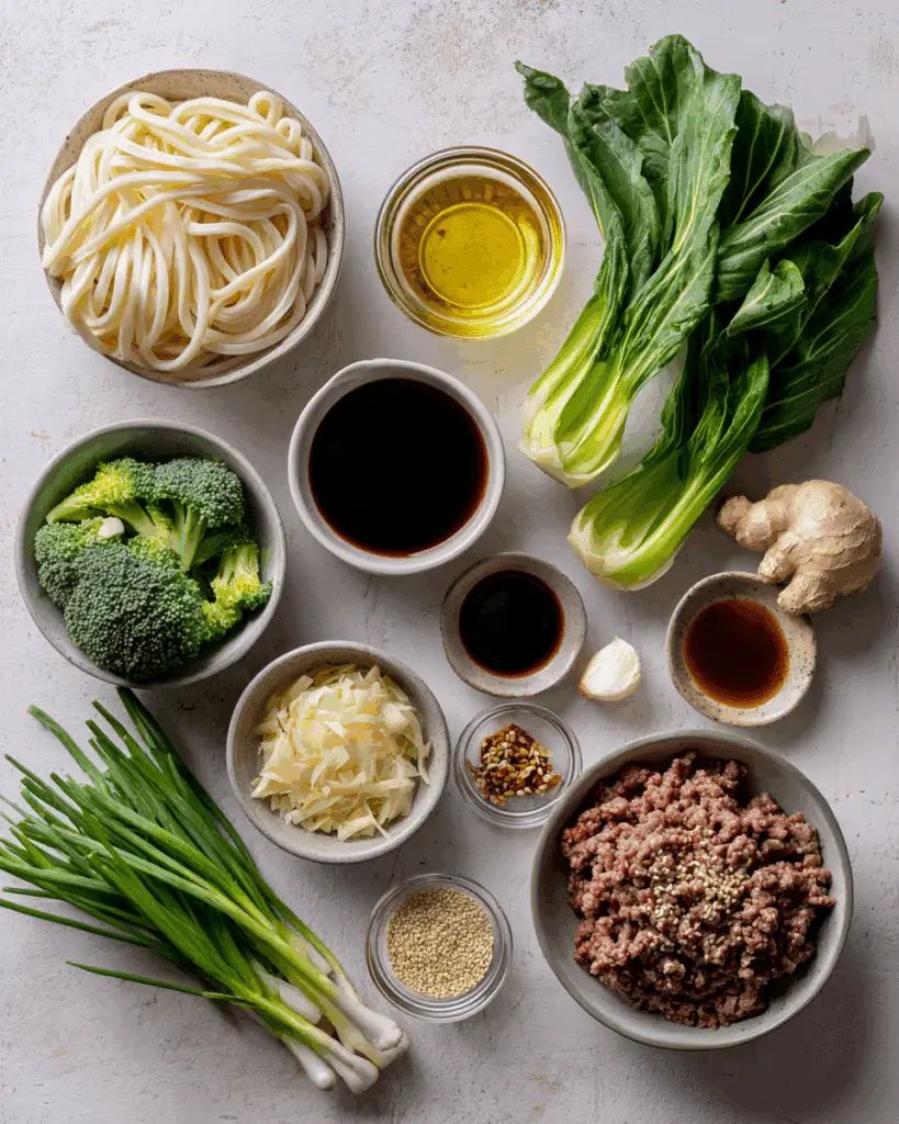 Thick, chewy udon noodles tangled in a glossy, savory sauce. Tender ground beef mingled with fresh bok choy and bright green broccoli florets, all kissed with garlic and ginger. The aroma is deep and nutty with a touch of sweetness, and every bite gives you a warm, soul-hugging sensation. This dish is not just quick to whip up, it’s the kind that makes you feel like a kitchen wizard without trying too hard.